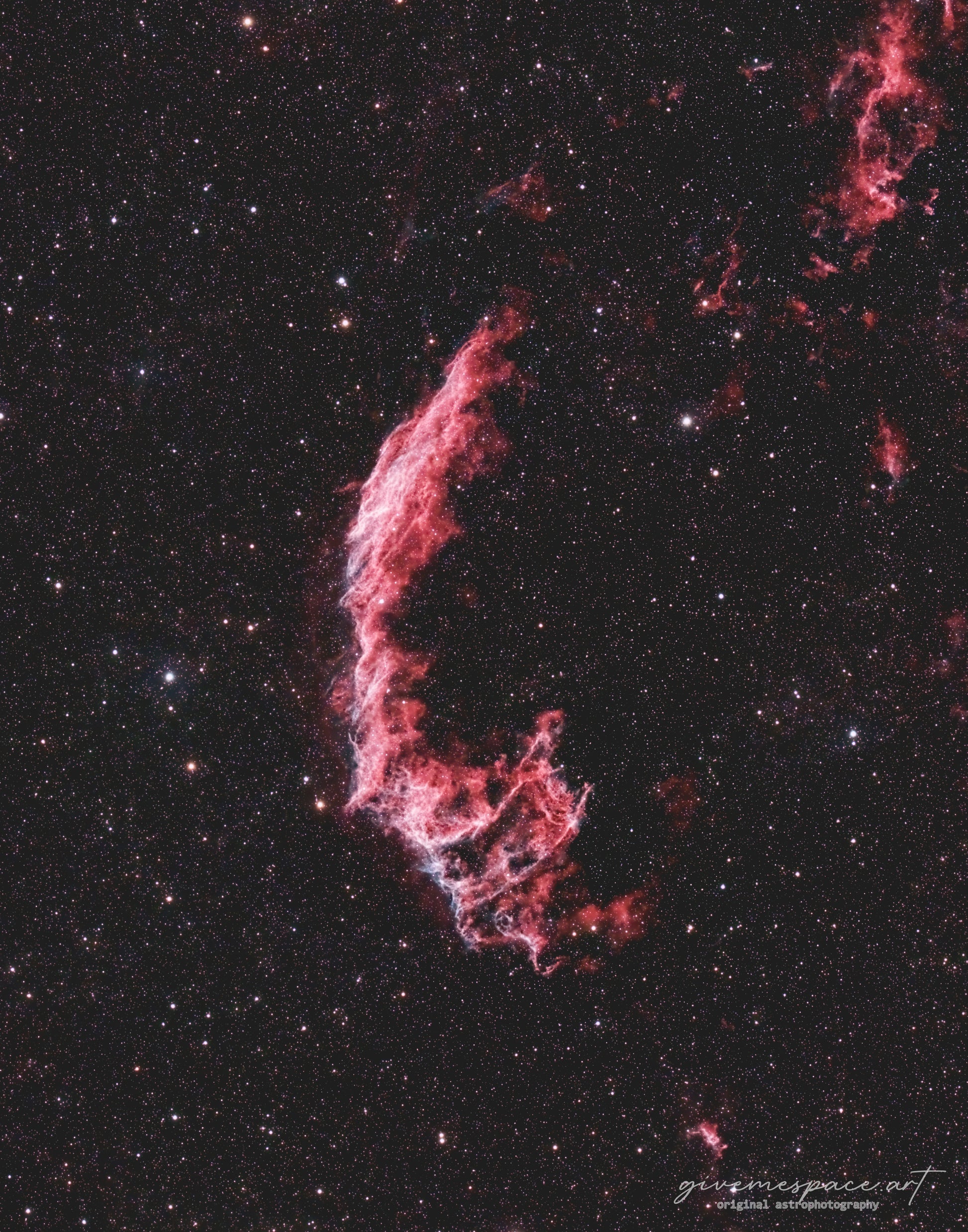 The eastern portion of the Veil Nebula is part of a vast supernova remnant, with intricate filaments of glowing gas forming this distinct, alien shape. Photographed from Guelph, Ontario.