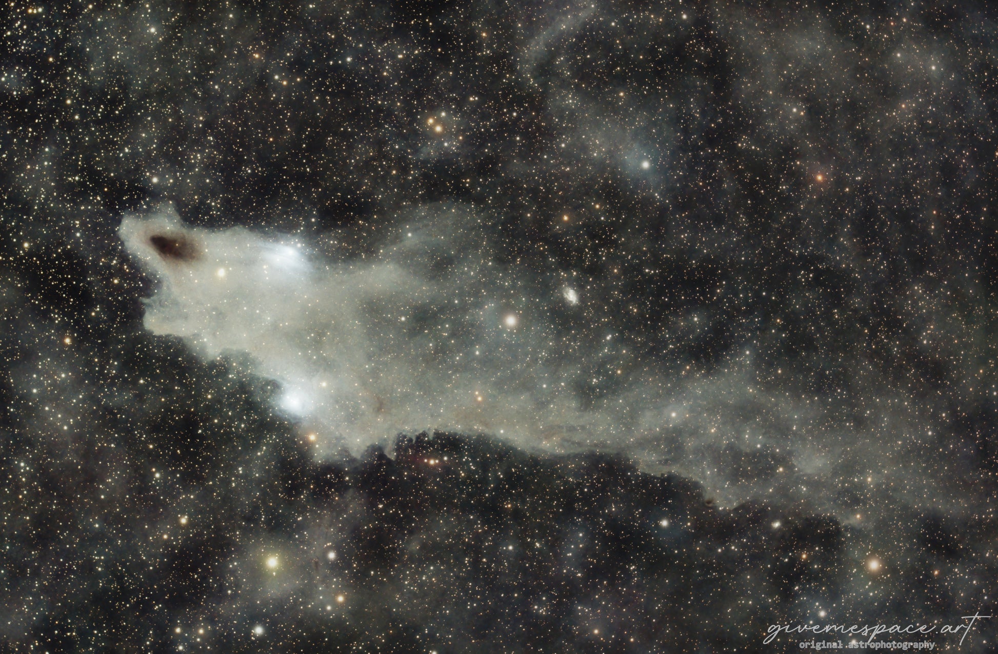 Patrolling the depths of interstellar space in the constellation Cepheus, the Dark Shark is an unforgettable sight in long photographic exposures. Dense clouds of interstellar dust absorb and reflect background starlight across a vast region of space, giving rise to the surreal shape of the Shark. Photographed near Belwood Lake, Ontario using a Starfield telescope and ZWO camera.