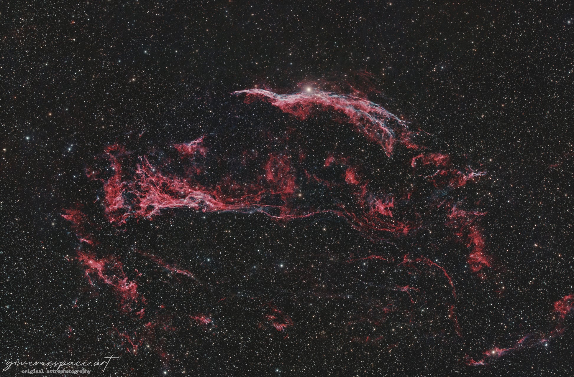 The Veil Nebula supernova remnant is one of the most striking objects in the sky, a vast complex of glowing gaseous filaments stretching across a hundred light years. The western portion shows the famous "witch's broom" structure, Pickering's Triangle, and plenty of other intricate components of the ancient stellar explosion.
